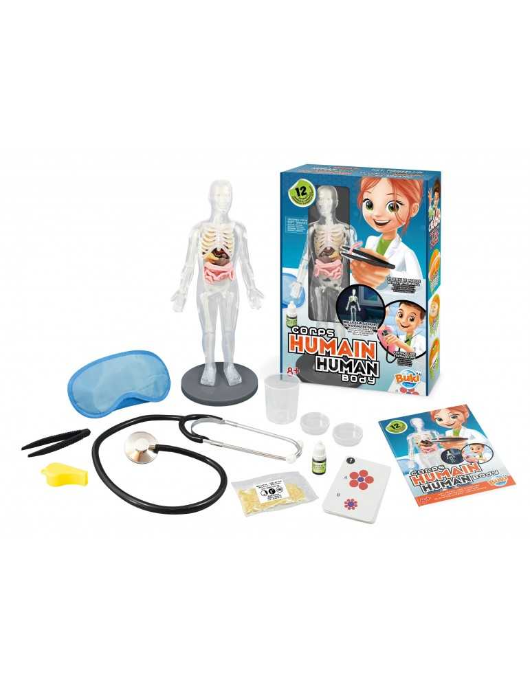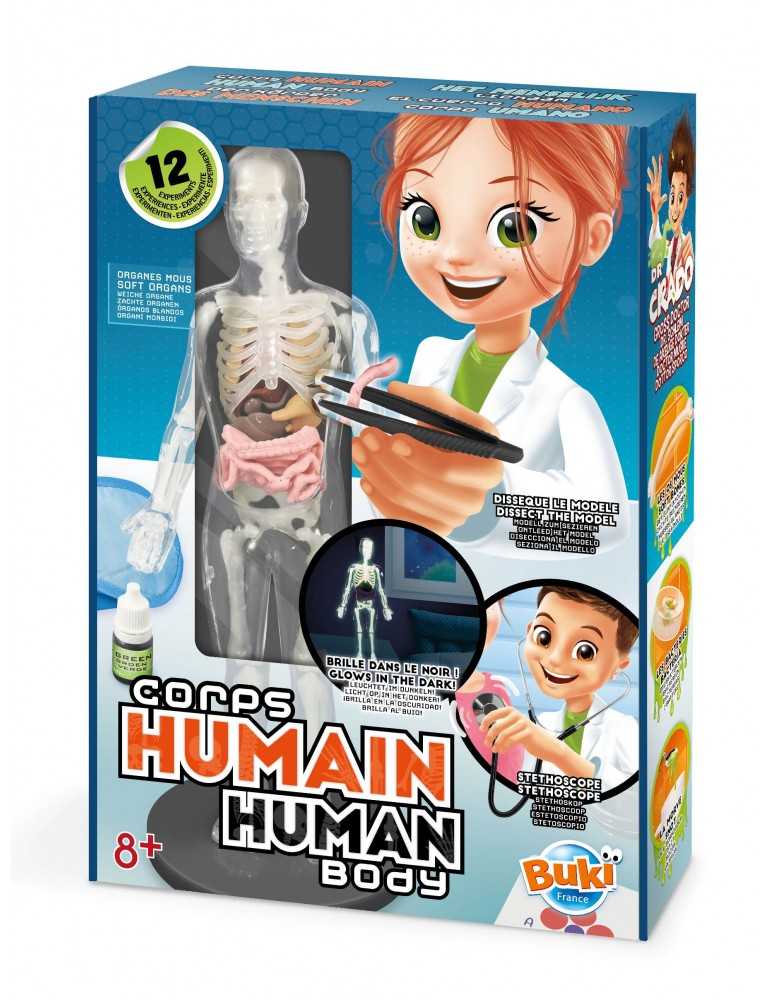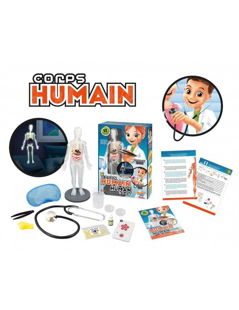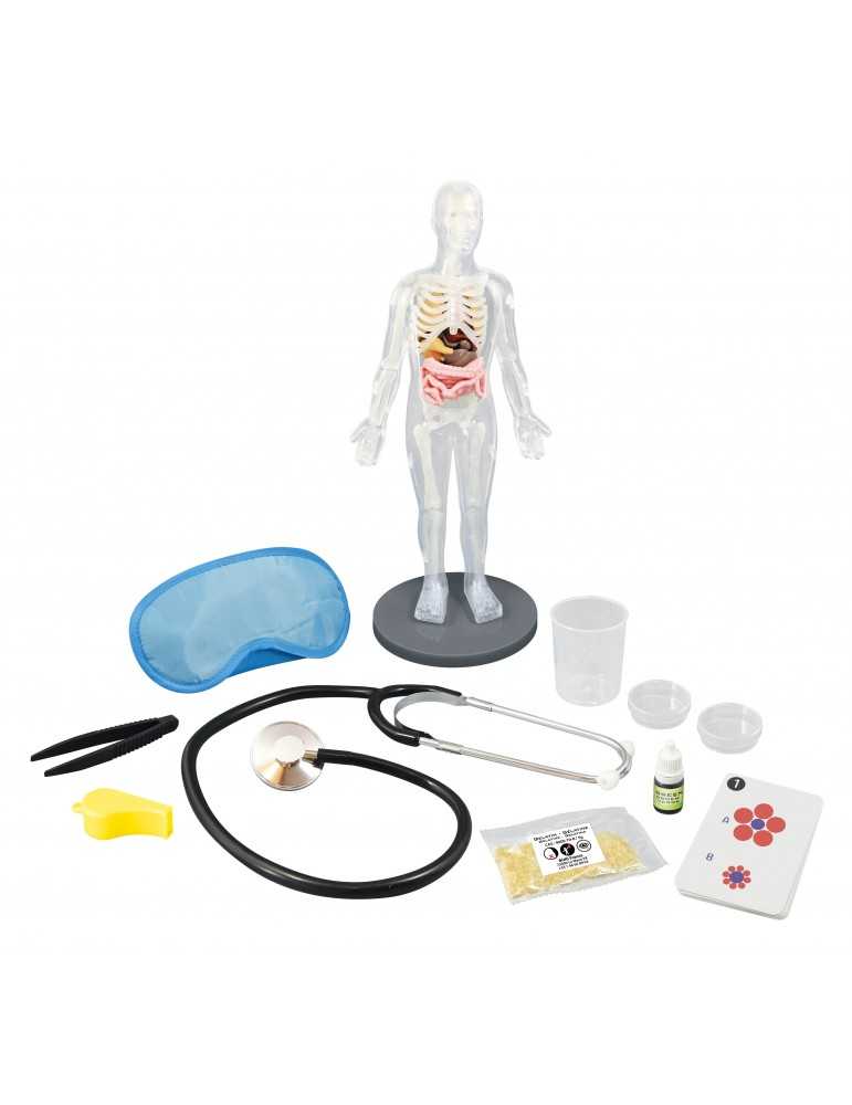 Ένα μοντέλο του ανθρώπινου σώματος, με μαλακά όργανα για χειρισμό και φωσφορίζοντα οστά. Ανακαλύψτε 12 πειράματα για να καταλάβετε τα μυστικά της ανατομίας: καλλιεργήστε βακτήρια, δημιουργήστε βλέννα και ακούστε την καρδιά σας να χτυπάει με το στηθοσκόπιο. Περιλαμβάνει πλήρες εγχειρίδιο με οδηγίες.