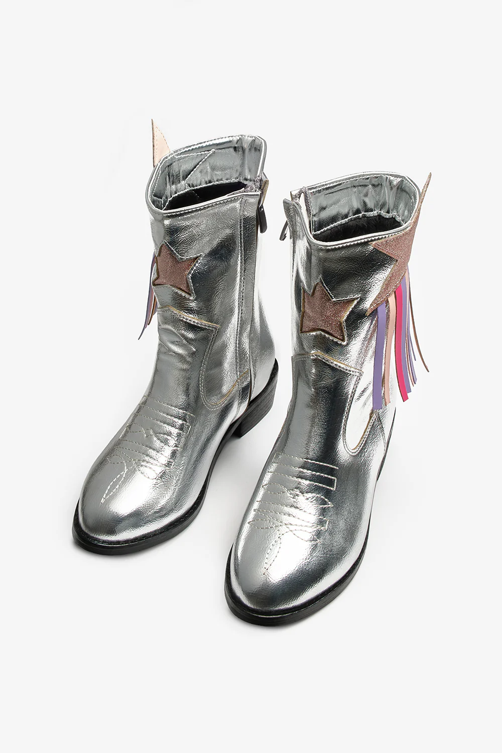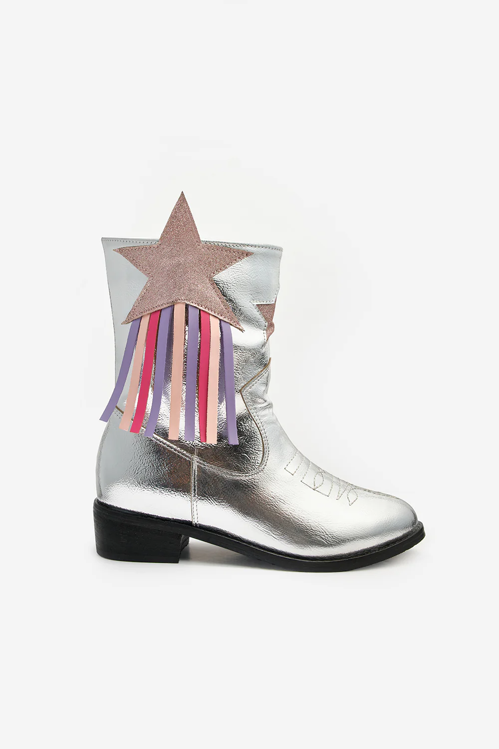 Ένα σίγουρο χτύπημα για κάθε νεαρή fashionista, αυτές οι παιδικές καουμπόικες μπότες προσδίδουν στο κλασικό καουμπόικο στυλ μια διασκεδαστική, μοντέρνα χροιά. Ένα μεγάλο, ασημί απλικέ αστέρι και η κρεμαστή φούντα στο πλάι τις κάνουν να τραβούν τα βλέμματα με κάθε βήμα. Είναι ιδανικές για καθημερινή χρήση, καθώς και για πάρτι γενεθλίων, θεματικές εκδηλώσεις ή ειδικές περιστάσεις.