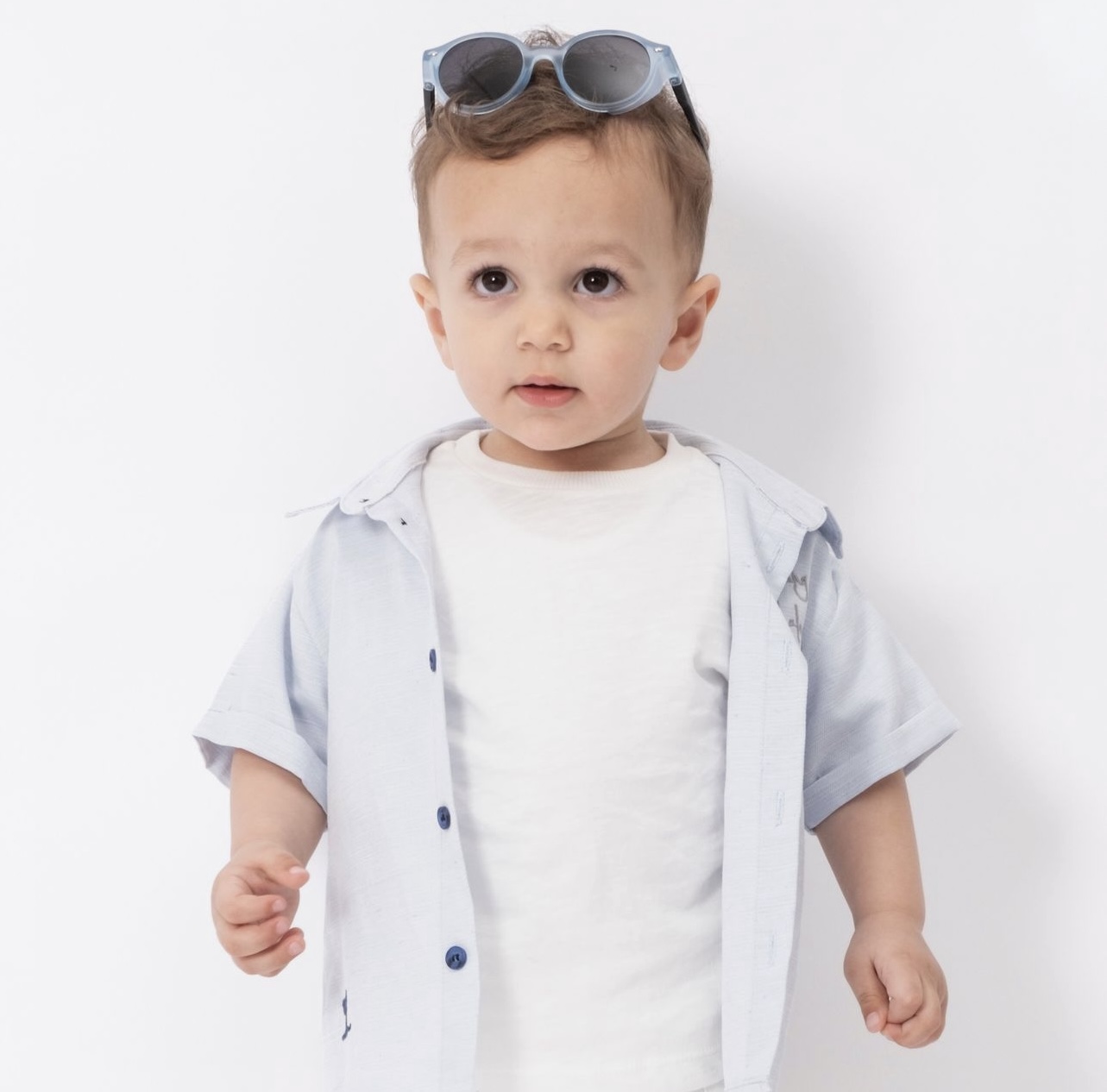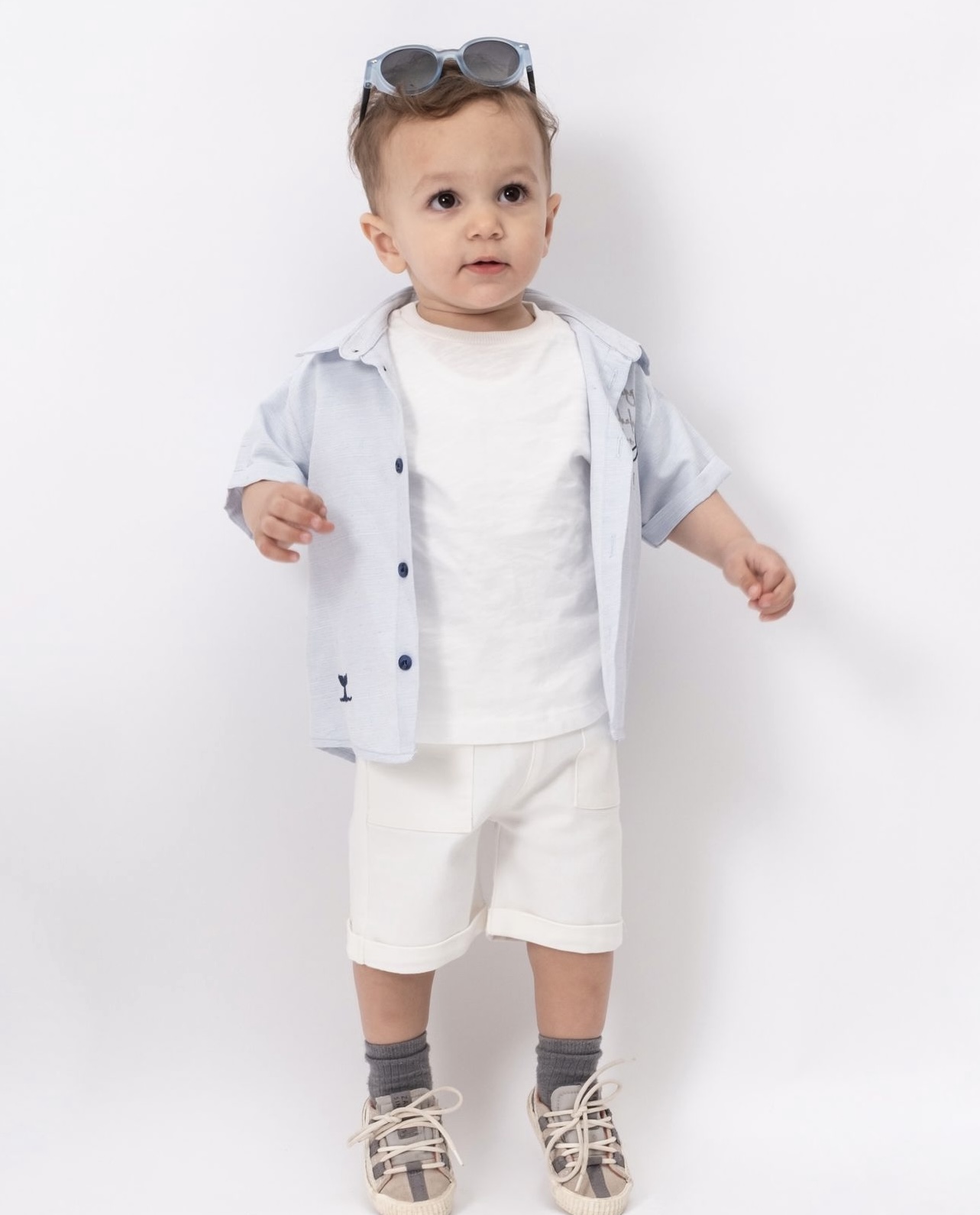 Σετ με πουκαμισάκι κοντομάνικο γαλάζιο, κοντομάνικη λευκή μπλούζα και σορτς λευκό με λάστιχο στην μέση και τσέπες.