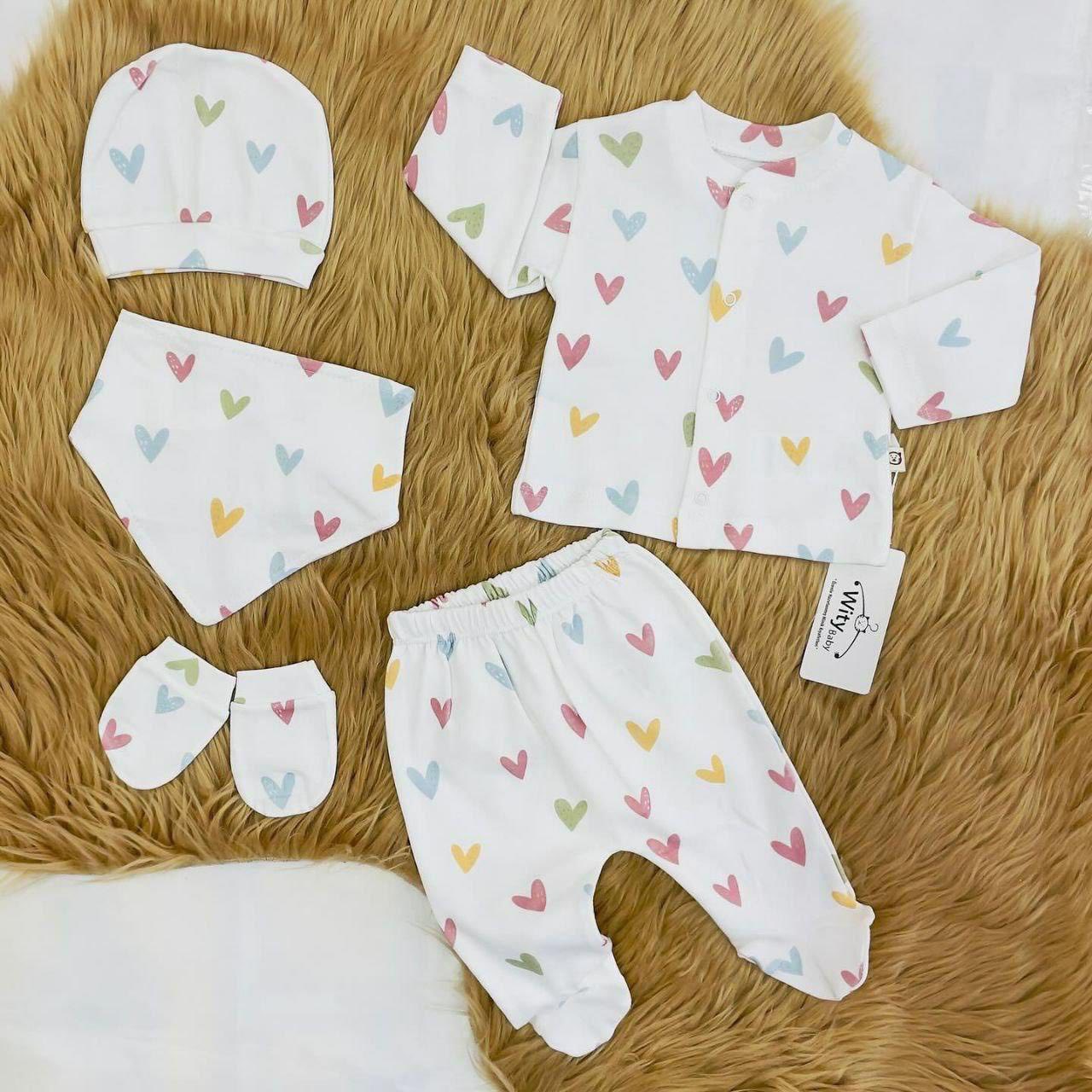 - Αποτελείται απο μπλουζάκι με κουμπάκια, σκουφάκι, σαλιάρα, γαντάκια και πεντελονάκι.