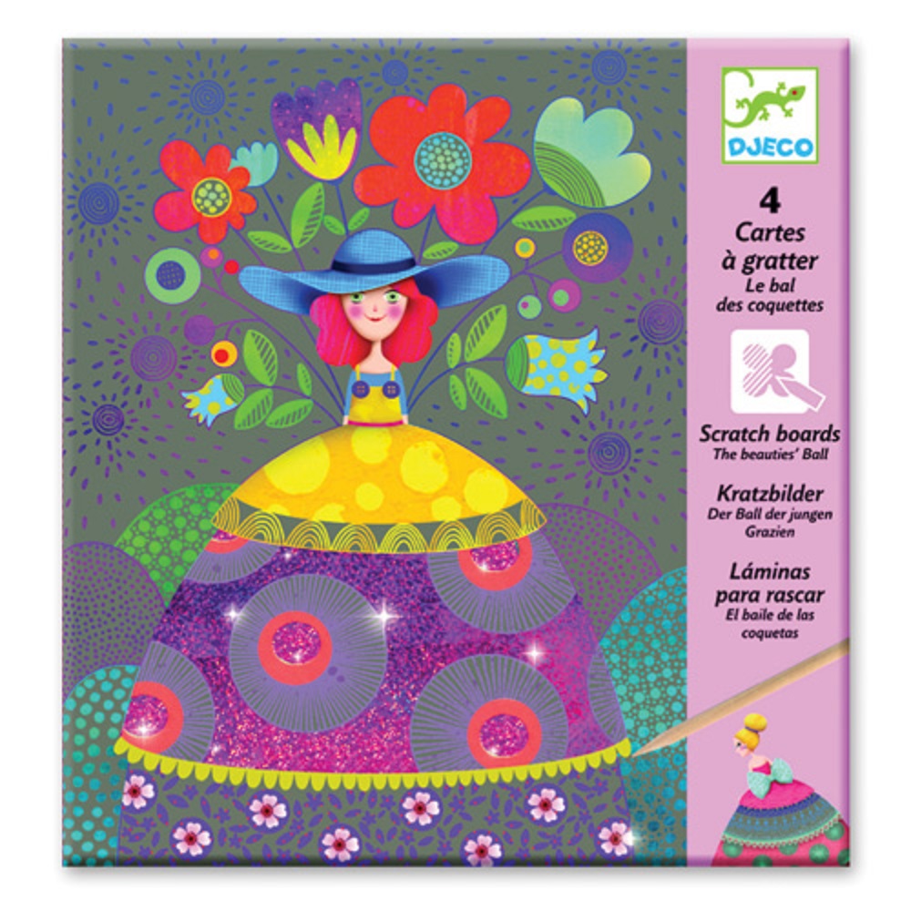 Καρτέλες ζωγραφικής από την εταιρεία Djeco τεχνοτροπίας ‘Scratch’. Χρησιμοποιήστε το ειδικό εργαλείο- ξυλάκι και αποκαλύψτε τις φιγούρες των κοριτσιών με τα πολύχρωμα φορέματα με μεταλλικές λεπτομέρειες. Η συσκευασία περιλαμβάνει τέσσερις καρτέλες με διαστάσεις 21×15 εκατοστά. Κατάλληλο για παιδιά 6 έως 11 ετών.