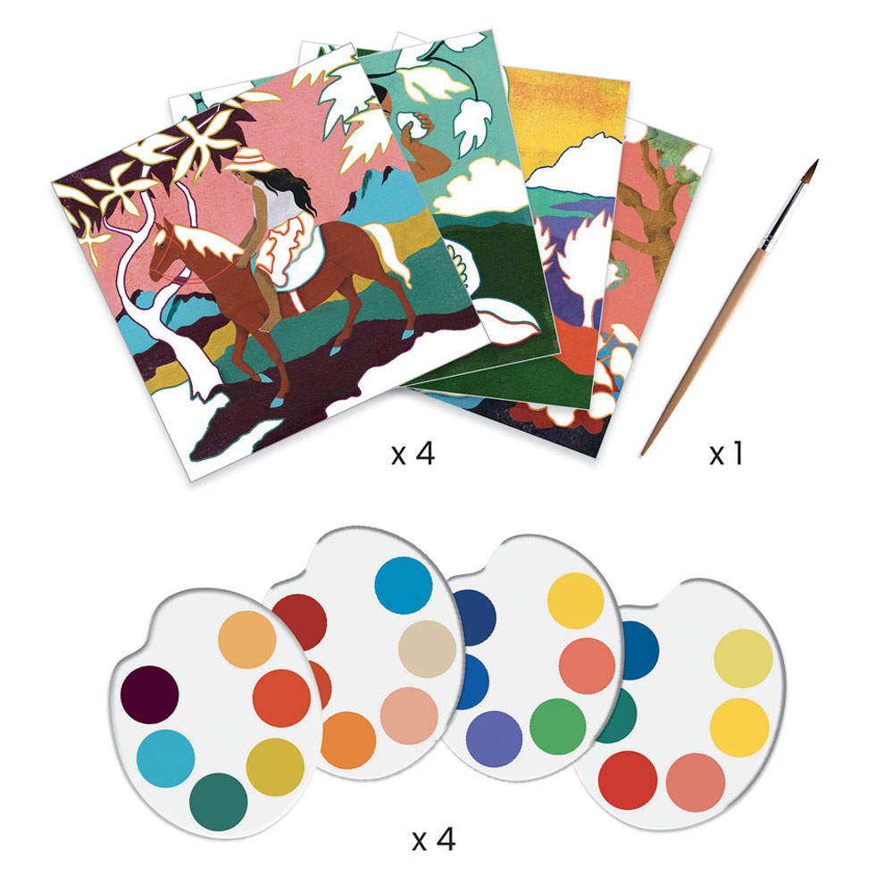 Ζωγραφίστε με ακουαρέλα και δώστε χρώμα στα τροπικά τοπία της Πολυνησίας! Εμπνευσμένο από τον Γάλλο ζωγράφο Paul Gauguin, αυτό το σετ εικαστικών της εταιρείας Djeco, προσφέρει στα παιδιά την πρώτη τους επαφή με το κόσμο της τέχνης και πιο συγκεκριμένα του καλλιτεχνικού ρεύματος του Μεταϊμπρεσιονισμού. Μια πρωτότυπη ενασχόληση που ελευθερώνει τη φαντασία και τη δημιουργικότητα των παιδιών, ενισχύει τη λεπτή κινητικότητά τους, ενώ παράλληλα προάγει την αισθητική νοημοσύνη τους μέσω της τέχνης. Το σετ περιλαμβάνει 4 κάρτες προς συμπλήρωση, 4 μίνι παλέτες με χρώματα, 1 πινέλο και εικονογραφημένες οδηγίες. Κατάλληλο για ηλικίες άνω των 7 ετών. Διαστάσεις συσκευασίας: 22 x 23 εκ.