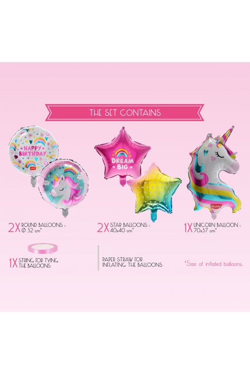 Περιλαμβάνει: 2 μπαλόνια διαμέτρου 32 εκ., 2 μπαλόνια διαστάσεων 40×40 εκ., 1 μπαλόνι μονόκερο 70×37 εκ., 1 tape και 1 καλαμάκι.