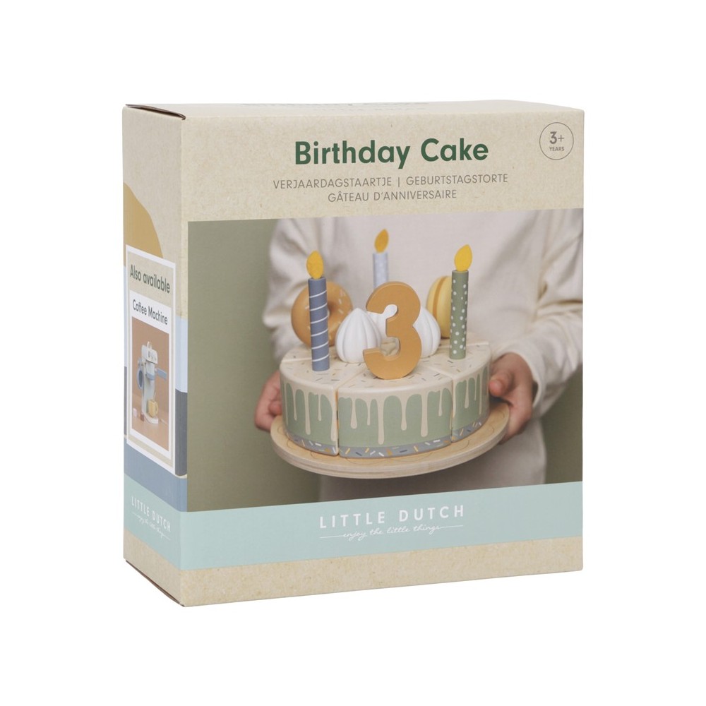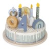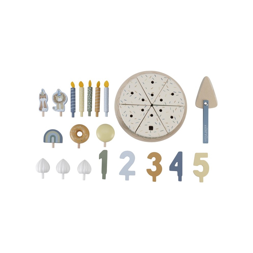 Ξύλινη τούρτα γενεθλίων Μπλε, 26 τεμάχια από την Little Dutch. Χιπ χίπ ζήτω! Βγάλτε τις γιρλάντες, γιατί με την τούρτα μας, κάθε μέρα είναι ένα πάρτι! Διακοσμήστε την τούρτα σας με μακαρόν, ντόνατ, ουράνιο τόξο, ζώο και σαντιγί και κεράστε όλους τους καλεσμένους από ένα κομμάτι. Καλή διασκέδαση στο πάρτι. Το σετ περιλαμβάνει έξι κομμάτια τούρτας σε δίσκο, ένα σερβίτσιο τούρτας, ντόνατ, μακαρόν, λιοντάρι, αλεπού, ουράνιο τόξο, κεριά, διακοσμητικά σαντιγί και διακοσμητικά με αριθμούς (1-5).