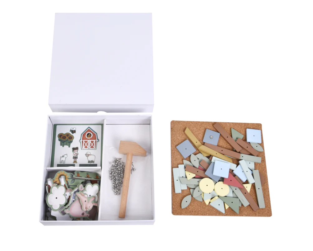 Το σετ περιλαμβάνει σφυράκι, πασσαλάκια καθώς και έναν συνδυασμό ξύλινων γεωμετρικών σχημάτων και εικονογραφημένων φιγούρων από χαρτόνι υψηλής ποιότητας. Τα παιδιά μπορούν να αφήσουν τη φαντασία τους ελεύθερη και να δημιουργήσουν τις πιο όμορφες φανταστικές σκηνές.