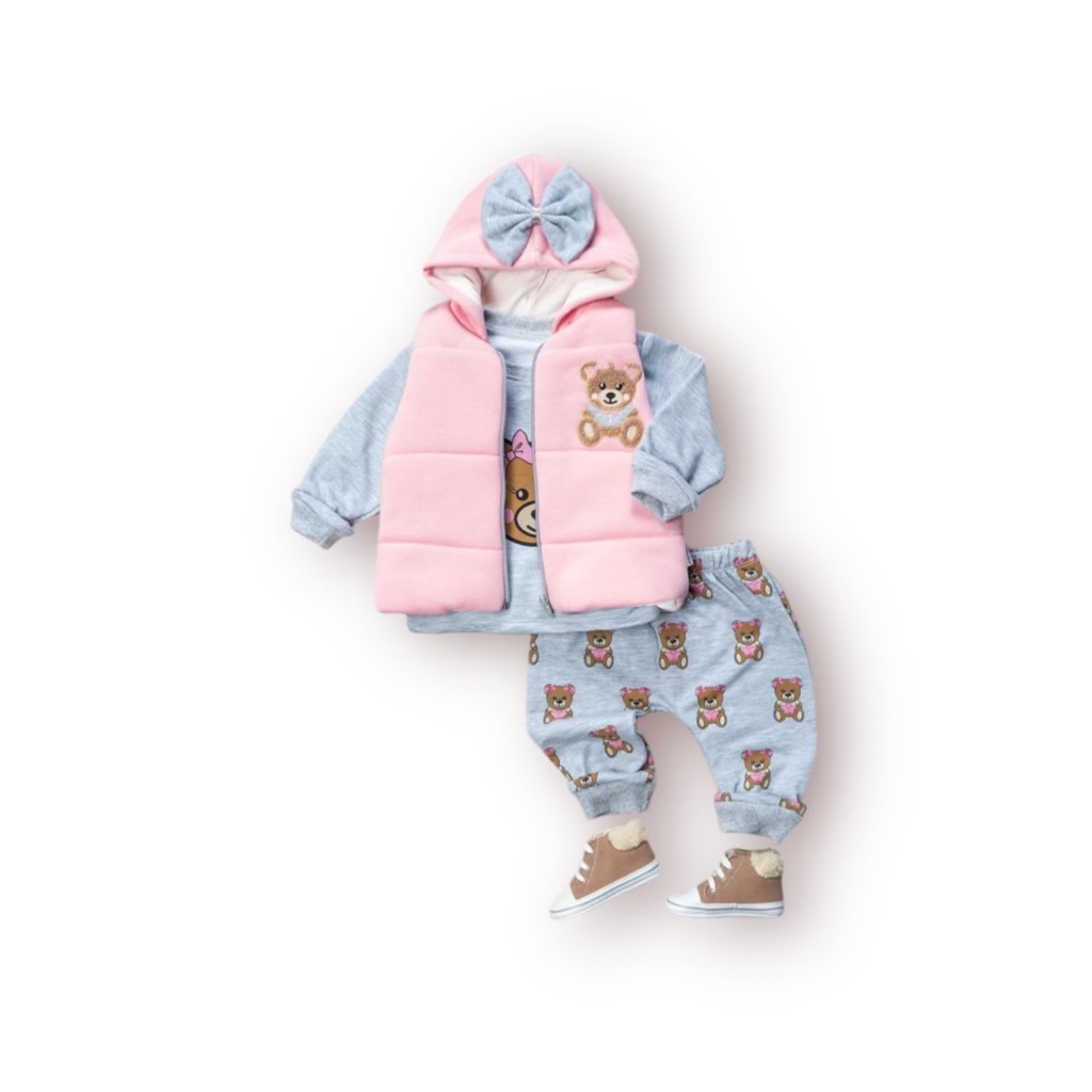 Σετακι με αμανικο ροζ μπουφανακι, μακρυμανικη μπλούζα , φορμα με αρκουδάκια και λάστιχο στο τελείωμα.