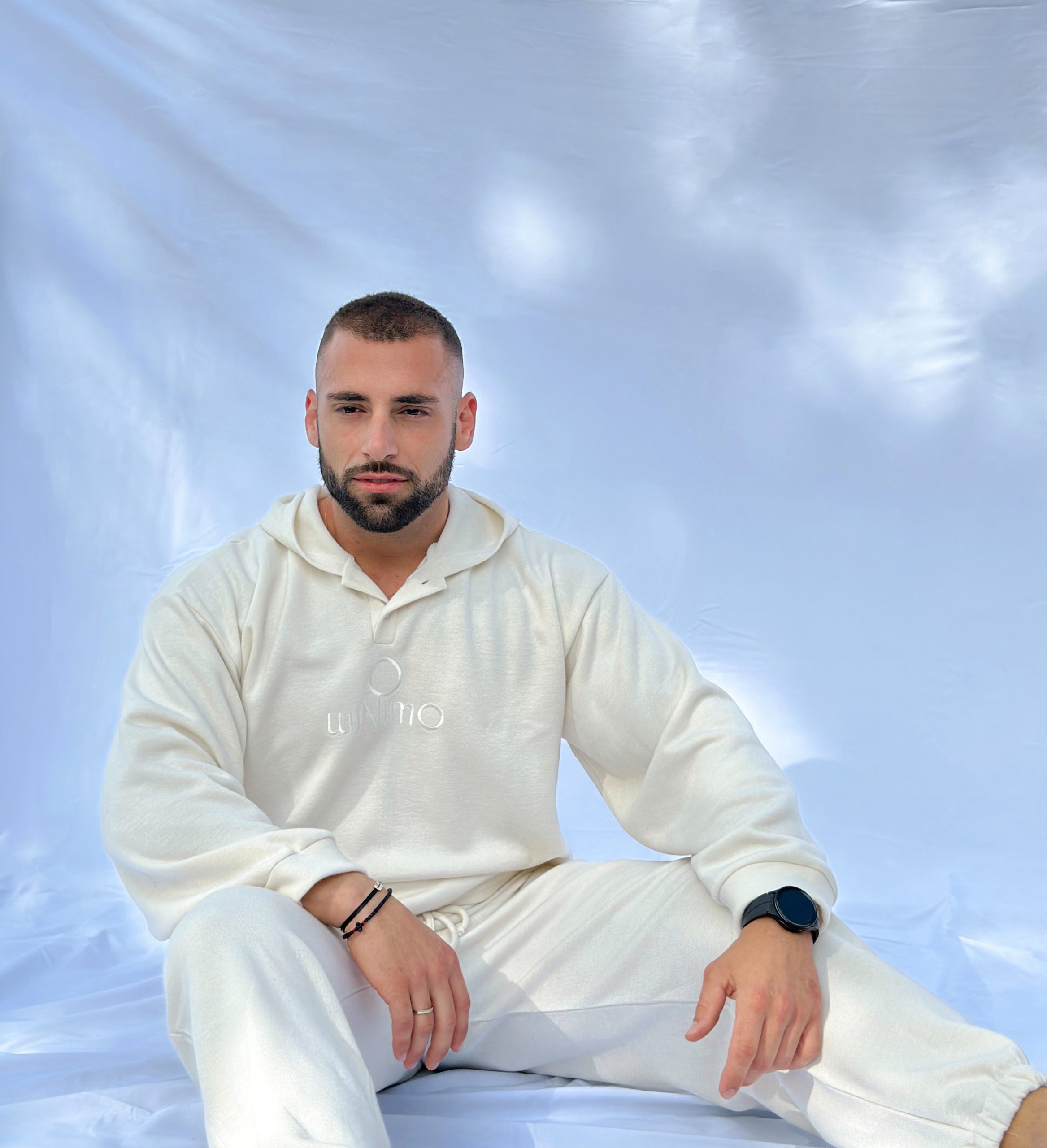 Σετακι αντρικό μπλούζα πλέκτη με κουκούλα και παντελόνι πλεκτό με κορδόνι στην μέση.