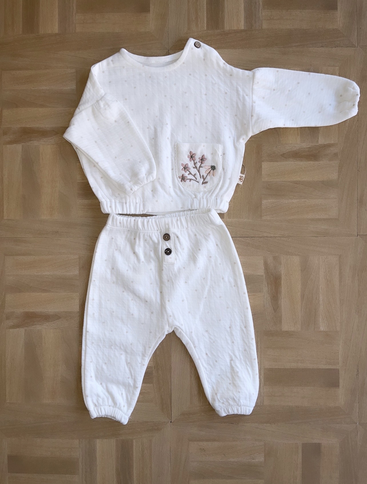 Λευκό σετ με πουά λεπτομέρειες και τσεπάκι με ανάγλυφα λουλουδάκια , πολύ απαλό και άνετο.